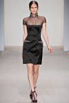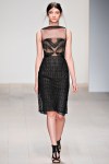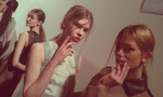 Val Garland lead the MAC makeup team to create high cheekbones using MAC’s sculpting cream. Lips were lightly stained with a powder blush ‘Dame Satin‘.
