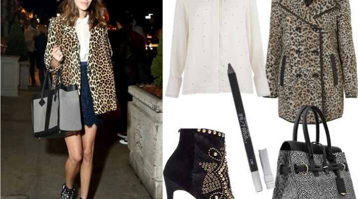 L-R: Ted Baker Hew Shirt, Topshop Leopard Wool Coat, Zara Studded Ankle Boots, Urban Decay Black Eye Kohl, Reiss Diane Bag