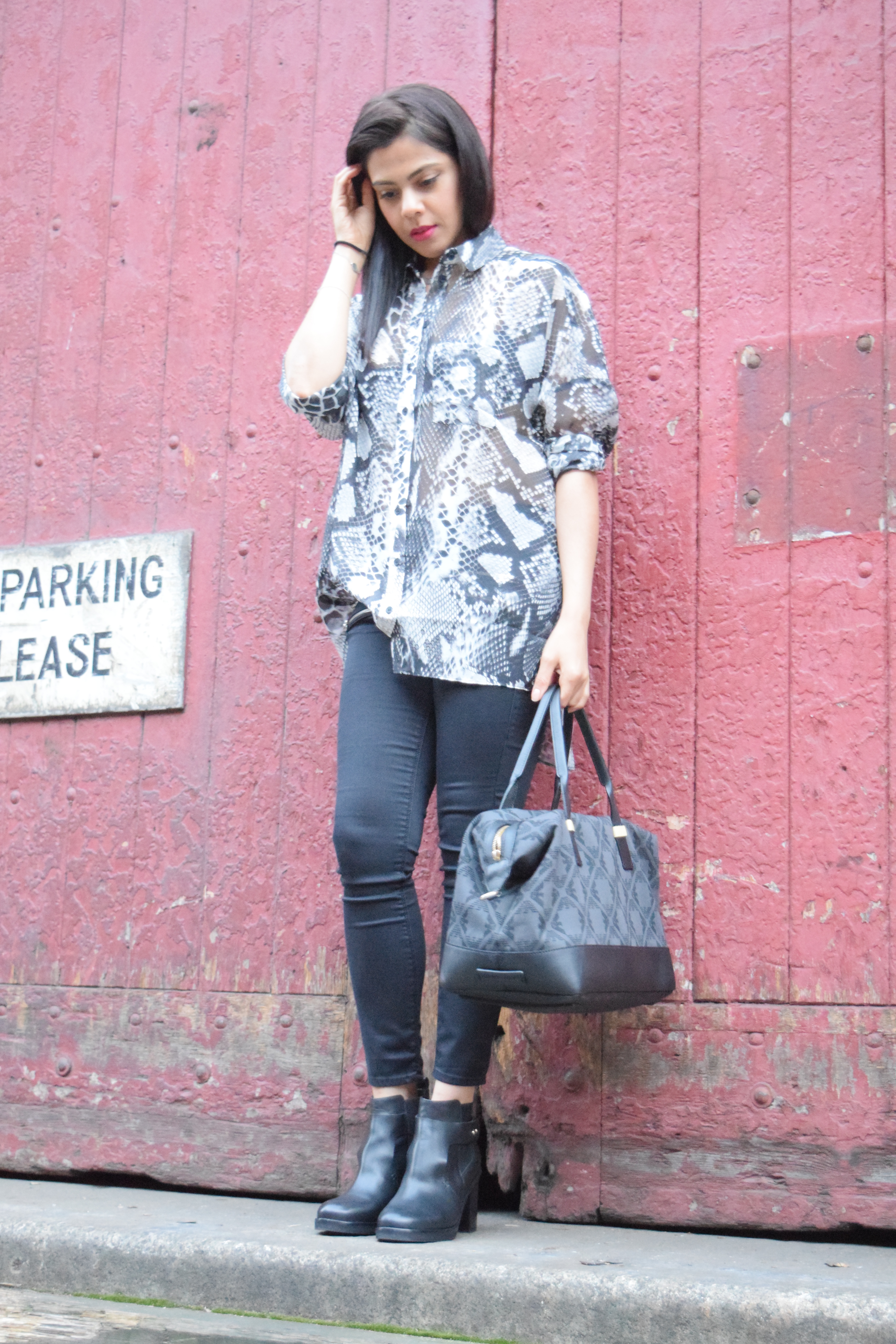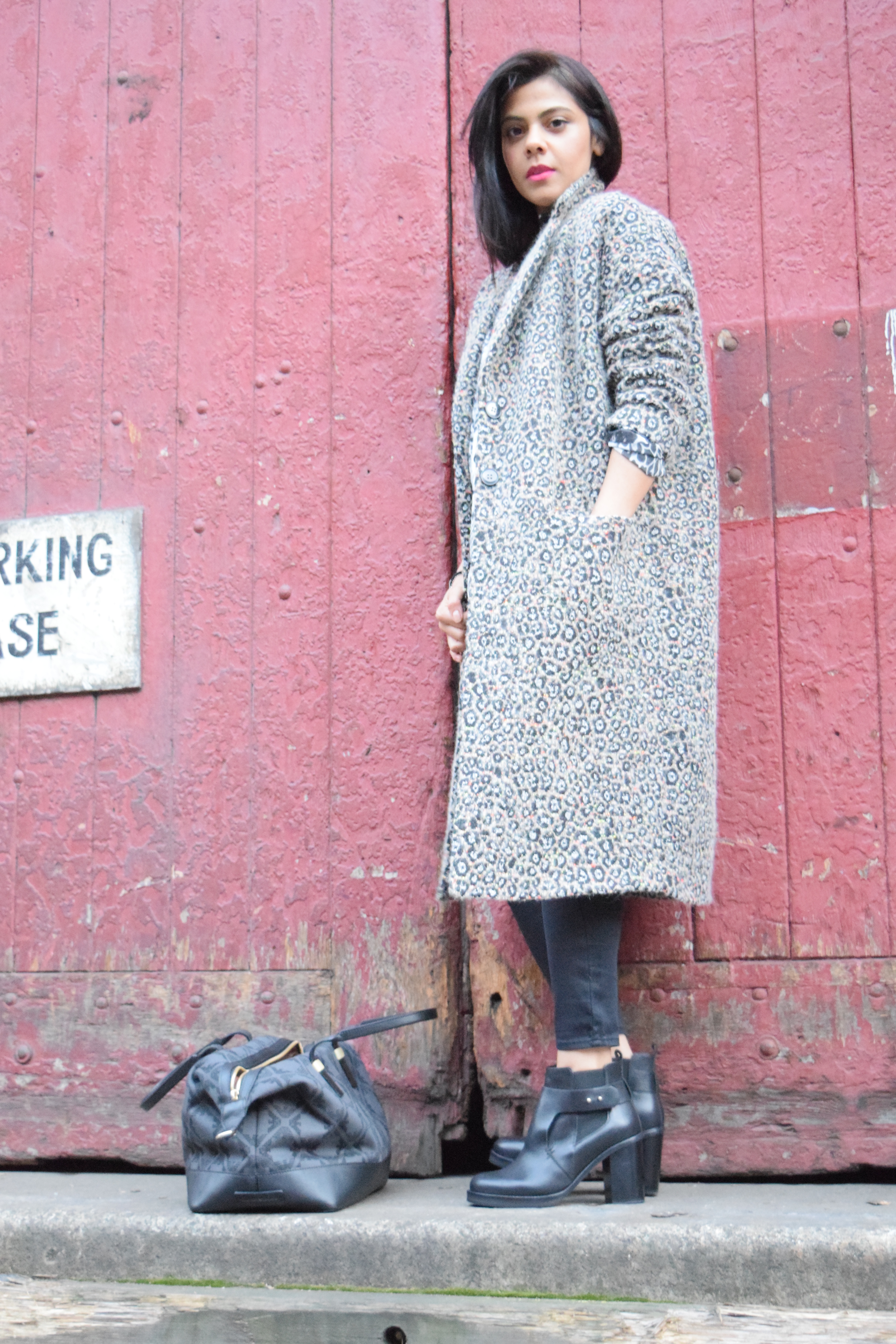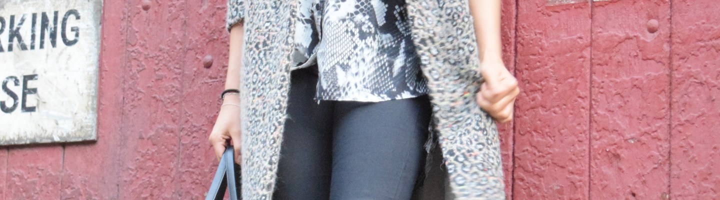 If at first you don’t love it, just keep starring. You soon will! I wasn’t overly keen on this oversized coat at first, mostly because of the Cheetah print that covers it. Nothing against Cheetahs, but all over a coat just conjures up embarrassing images of trashy chicks, in stilletos, covered head to toe in animal print! I soon got over that thought and decided that since i’m not trashy, and generally hate stilettos, this coat was perfect for me. I also totally fell for the neon splashes which breaks up the print. It looks great teamed with black or grey. I’ve worn it here with these mega comfy skinnies and an oversized (snake print) shirt.