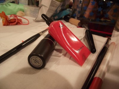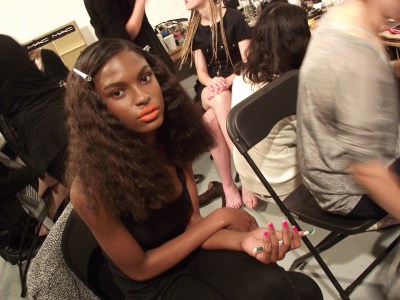 Backstage, i was with the OPI tech team picking the brightest and boldest shades for nails. Celeb stylist Karl Plewka wanted nail colours to coordinate but not match the bright orange lips that the models would be sporting. He wanted to create a Tom Ford-esq look for the runway.