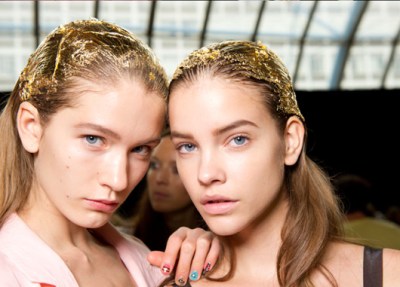 Keeping in line with the collection, models were given a Cleopatra meets ghetto look. They sported wet look hair combed back and draped in gold leaf. Toe nails matched in metallic gold polish, while fingernails by the amazing Sophy Robson were multi-coloured and crafted with ancient Egyptian symbols over the top. Makeup was nude but sculpted with defined brows and cheekbones.
